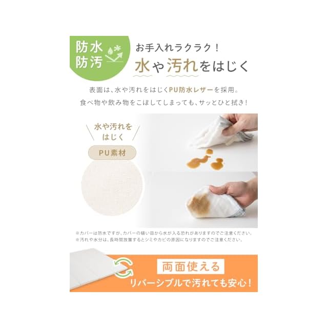 【サッとひと拭き♪お手入れ楽々】 プレイマットの表面は、水や汚れをはじくPU防水レザーを採用。食べ物や飲み物をこぼしてしまっても、サッとひと拭きでキレイな状態をキープできます。お手入れも簡単なので、いつも清潔にお使いいただけます。※カバーは防水ですが、カバーの縫い目から水が入る恐れがありますのでご注意ください。※汚れや水分は、長時間放置するとシミやカビの原因になりますのでご注意ください。