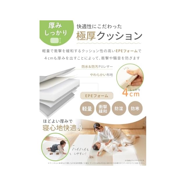 【EPE素材を採用】 表面は水や汚れをはじくPU素材、プレイマットの中心部は、EPE素材を採用。EPE素材は、軽量で衝撃を緩和するクッション性に優れた素材。高密度素材なので、湿気や寒さを防ぐのにも効果的です。他製品によく使われている素材と比較しても、EPE素材は優れた効果を発揮!防水性・弾力性に優れ、軽量、においも気になりません。快適さと機能性を兼ね備えています。