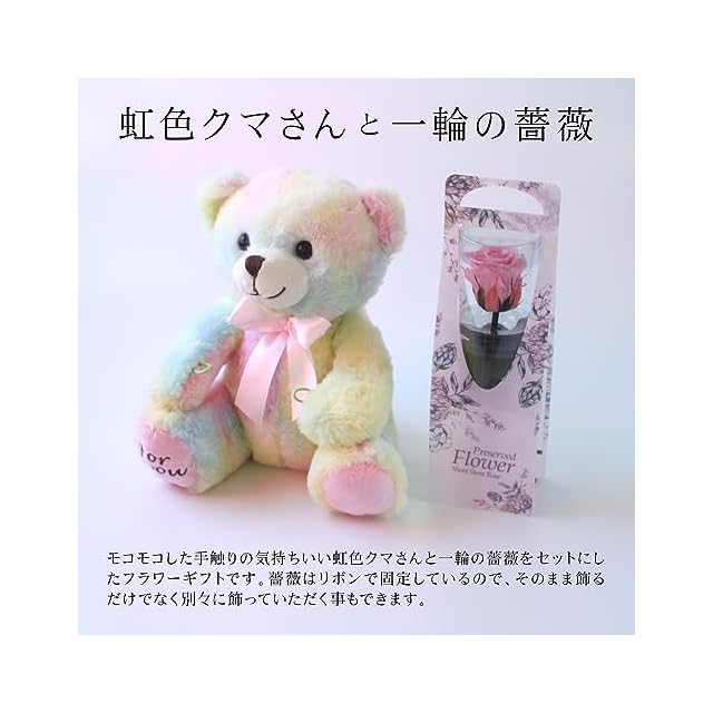 商品名:プリザーブドフラワー プリザードフラワー クリアケースL 付き 虹色クマさんと一輪の薔薇 ピンク プレゼント お祝い 記念日 誕生日 アレンジ リボン付き アレンジ フラワーギフト フラワーアレンジメント 枯れないバラ 花 女性 くま 母の日 プレゼント 花