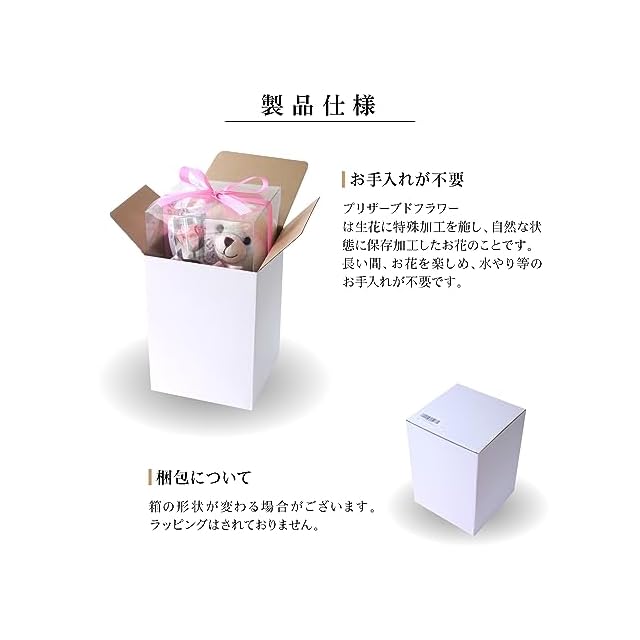 【お手入れが不要】プリザーブドフラワーは長期間きれいな状態を保てる、枯れないお花です。直射日光を避け、高湿度に注意すれば長期間お楽しみいただけます。(本商品はドライフラワーではございません)[本商品はボトルの中にリキッドは入っていない商品です。]