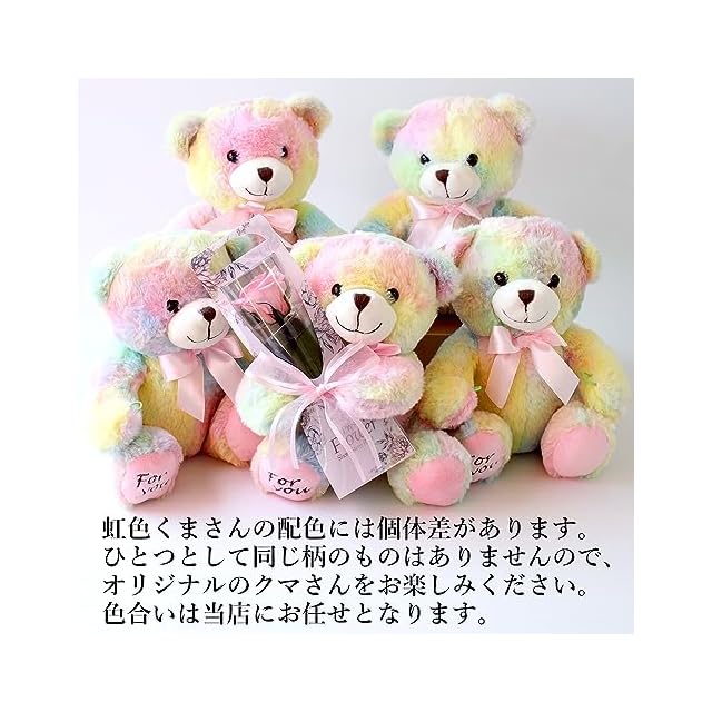 【各イベントやお祝いに】パステルカラーのテディベアが、一輪のバラを抱いて思いを届けてくれます。誕生日や結婚祝い、出産祝い等、プロポーズや母の日など、各イベントやお祝いに年齢を選ばず喜ばれます。ぬいぐるみと薔薇はリボンで固定、ほどくと別々に飾っていただくこともできます。