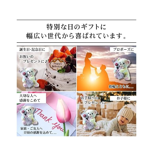 【特別な日のお祝いに】誕生日や結婚祝い、出産祝い等、各種お祝いにシーンを選ばず喜ばれます。日頃なかなか伝えられない感謝の気持ちをお花に込めて届けてみませんか? 【可愛らしいクマさんのぬいぐるみと一緒に】モコモコした手触りも気持ちいい可愛らしいクマさんのぬいぐるみと一輪の赤薔薇をセットにしたフラワーギフトです。薔薇はリボンで固定しているので、そのまま飾るだけでなく別々に飾っていただく事もできます。