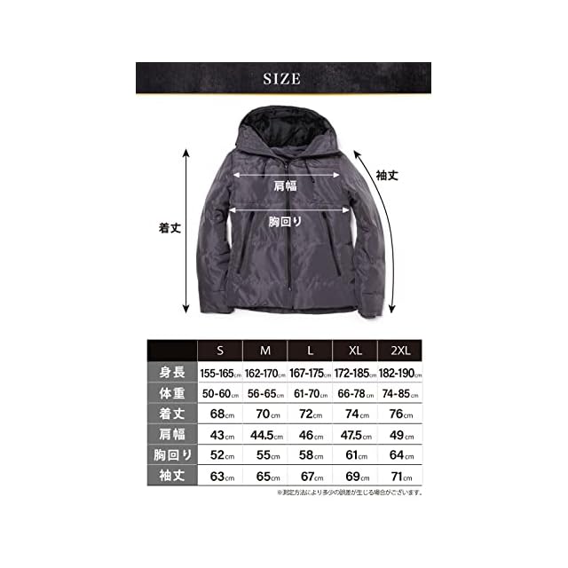 【 商品詳細 】生地・中綿共に高級ポリエステルを95%、ダウン5%使用。カラーはブラック、ネイビー、グレー、チャコールグレー。サイズはSサイズ、Mサイズ、Lサイズ、XLサイズ、XXLサイズをご用意しております。